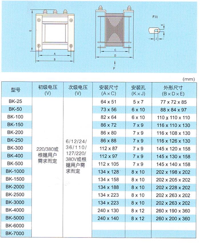 BK系列控制變壓器適用于50-60Hz的交流電路中,作為機床和機械設備中一般電器的控制電源、局部照明及指示燈電源。